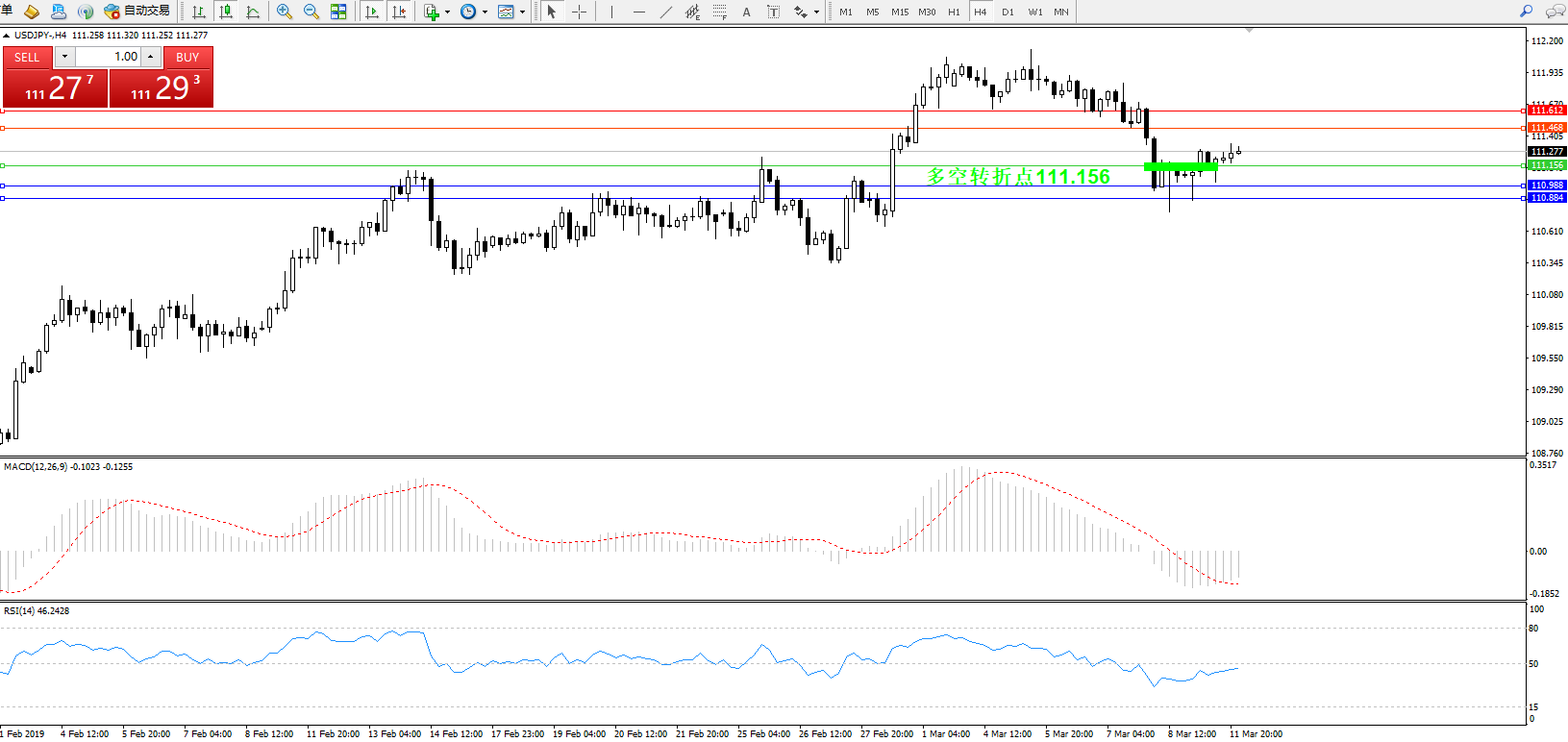 备选策略:111.156下方看跌,目标110.988、110.884