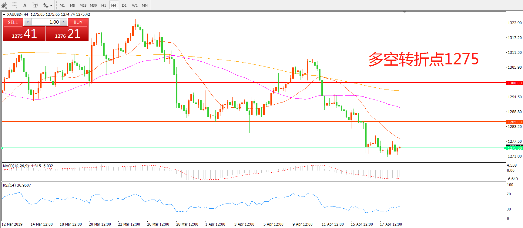 4小时图看,金价连续下行,短期走势疲态尽显,昨日虽有小幅企稳,但依然处于空头趋势,均线系统呈空头排列,周一开盘后重点关注1275一线得失。