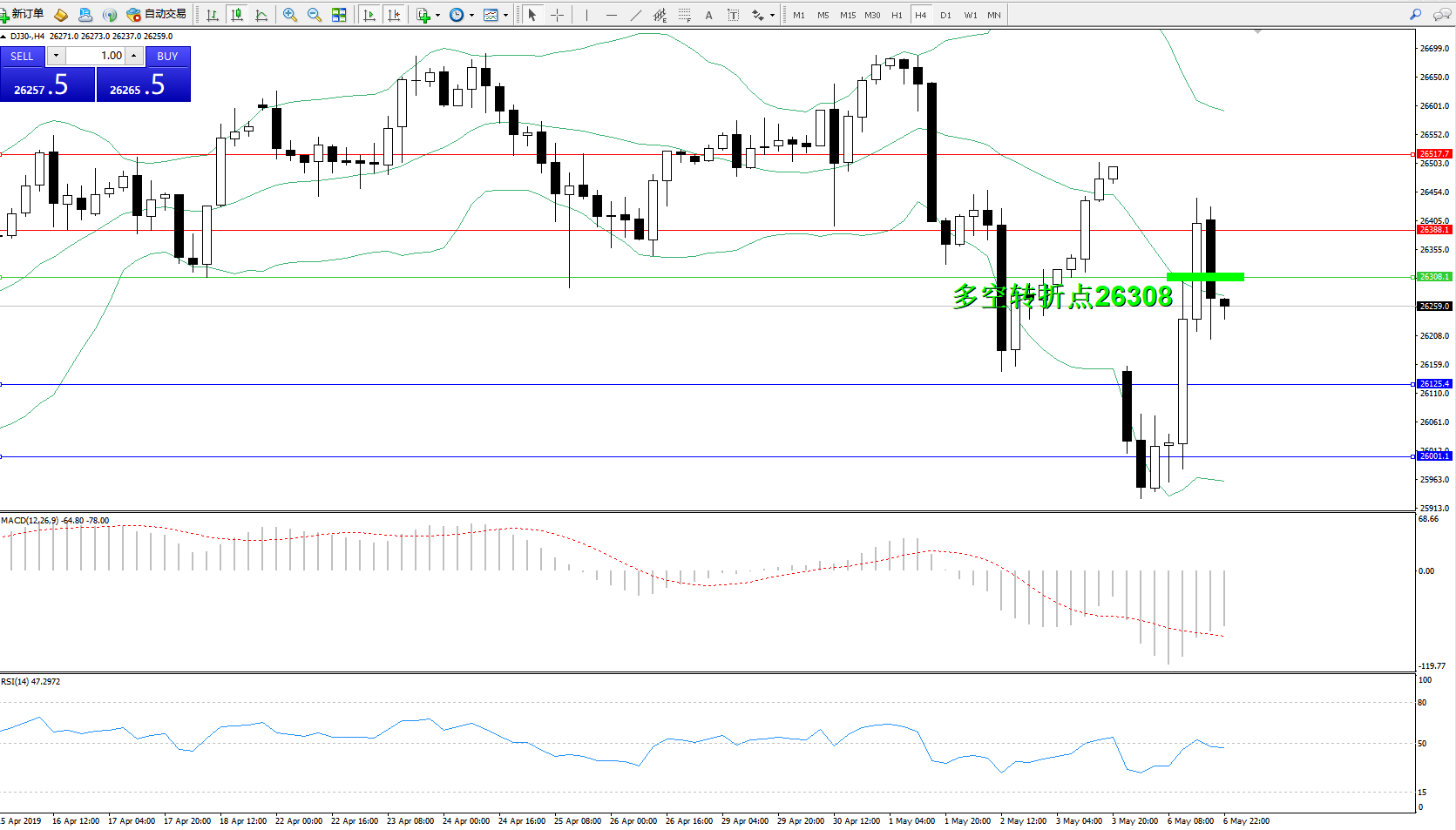 道琼斯指数DJ30—— 4小时K线图显示: