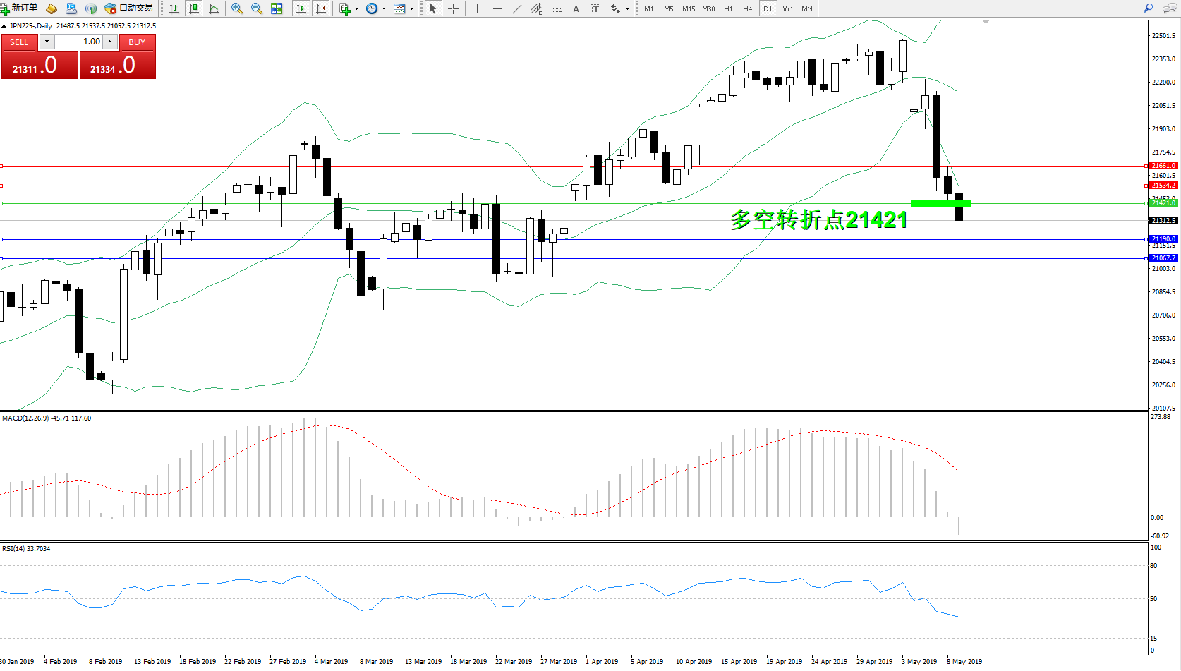 交易策略:21421下方看跌,目标21190、21067