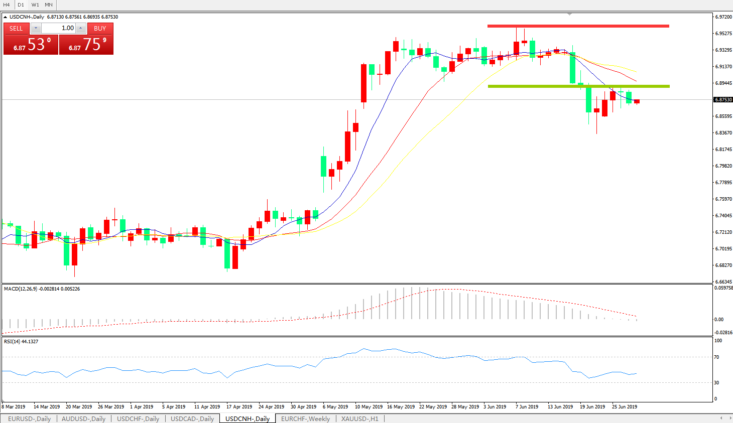 交易策略: 在6.8880之下,看跌,目标价位为6.8100,然后为6.7600。