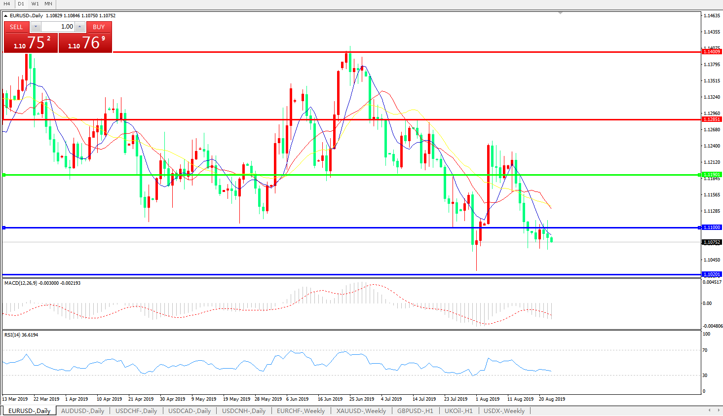 技术面简析:日图均线呈有序下行态势,汇价维持低位盘整偏弱势,MACD运行于0轴下方且动能柱延续放量态势,RSI延续跌势,预计短期汇价存整理修正需求,不排除局部小幅度反弹,但中期汇价料将逐步走低,关注前低1.10附近支撑是否持续有效。
