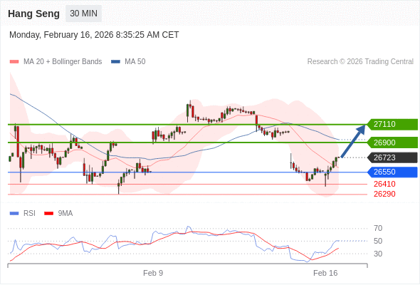 恒生指数 当日内: 上升。