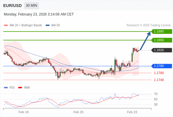 在 1.1780 之上,看涨,目标价位为 1.1855 ,然后为 1.1880 。
