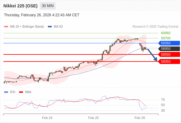 在 59350 之下,看跌,目标价位为 58550 ,然后为 58050 。