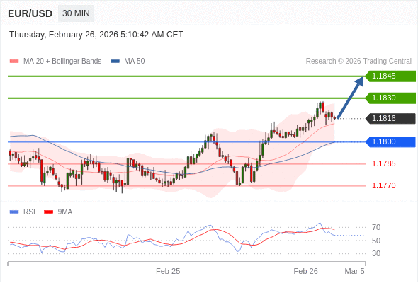 在 1.1800 之上,看涨,目标价位为 1.1830 ,然后为 1.1845 。
