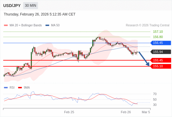 在 156.45 之下,看跌,目标价位为 155.45 ,然后为 155.10 。