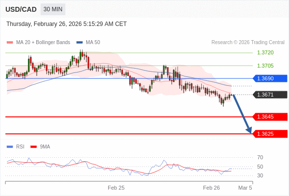 在 1.3690 之下,看跌,目标价位为 1.3645 ,然后为 1.3625 。