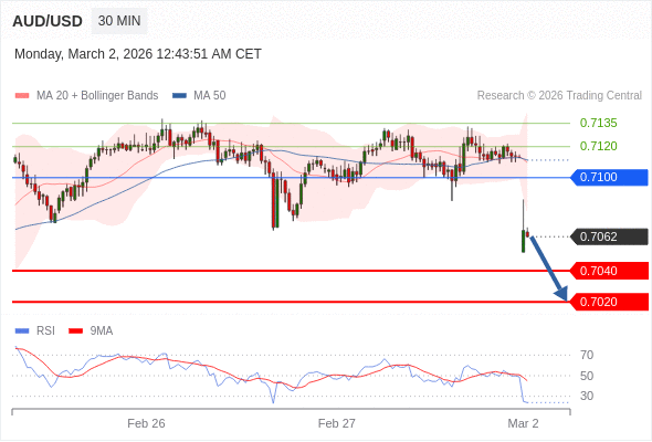 交易策略: 在 0.7100 之下,看跌,目标价位为 0.7040 ,然后为 0.7020 。