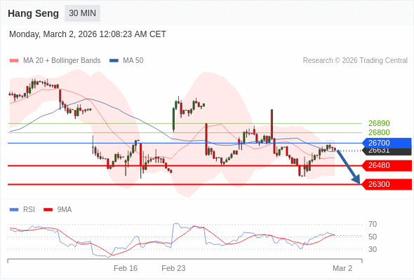 恒生指数 当日内: 目标位为26300。