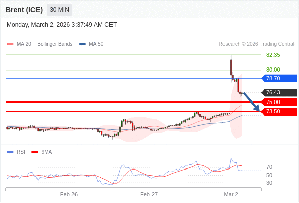 在 78.70 之下,看跌,目标价位为 75.00 ,然后为 73.50 。
