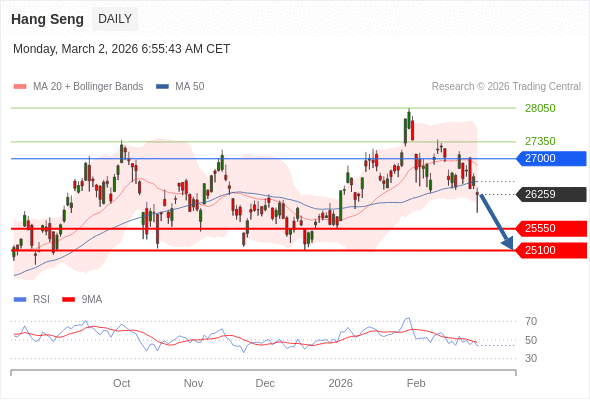 恒生指数 短线: 短期调整。