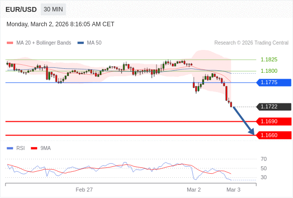 交易策略: 在 1.1775 之下,看跌,目标价位为 1.1690 ,然后为 1.1660 。