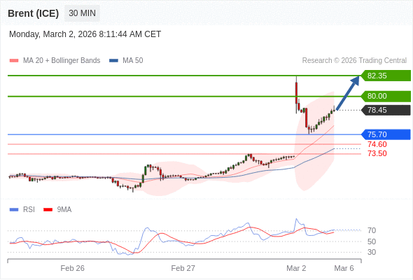 在 75.70 之上,看涨,目标价位为 80.00 ,然后为 82.35 。