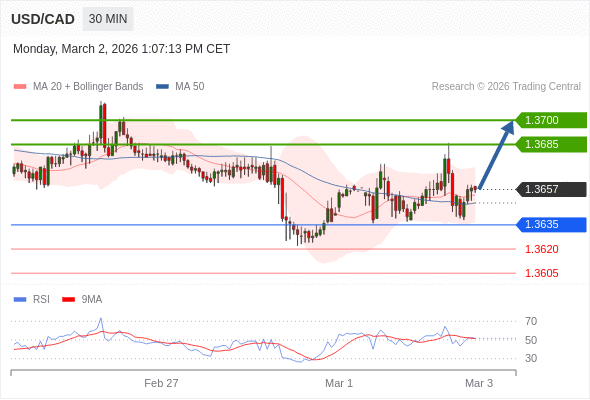 在 1.3635 之上,看涨,目标价位为 1.3685 ,然后为 1.3700 。