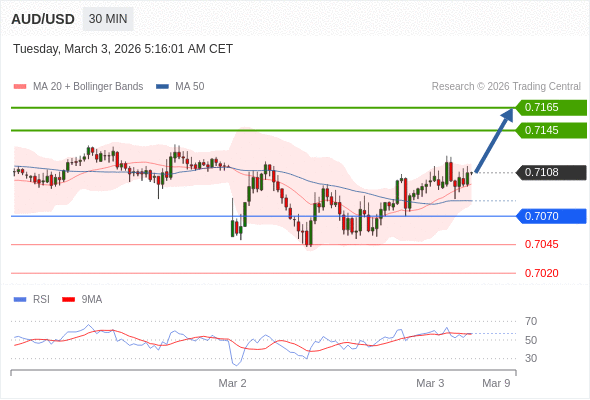 在 0.7070 之上,看涨,目标价位为 0.7145 ,然后为 0.7165 。
