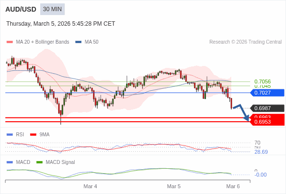 澳元/美元 当日内 : 看跌,在 0.7027 之下。