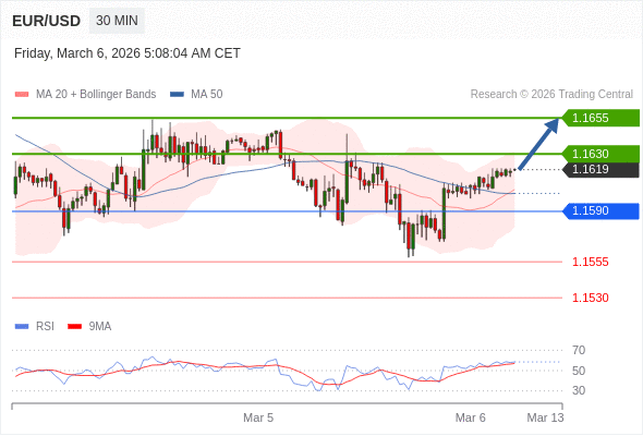 在 1.1590 之上,看涨,目标价位为 1.1630 ,然后为 1.1655 。