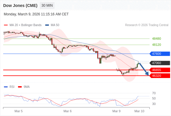 美国道琼斯指数期货 (H6) 当日内: 短期关键阻力位在47600。