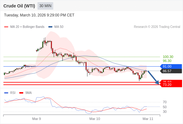 交易策略: 在 91.00 之下,看跌,目标价位为 75.50 ,然后为 73.20 。