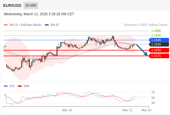 欧元/美元 当日内: 短期关键阻力位在1.1645。