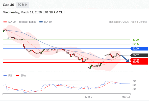 Cac 40 当日内: 短期关键阻力位在8200。