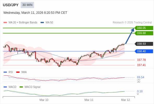 美元/日元 当日内 : 看涨,当 158.40 为支撑位。