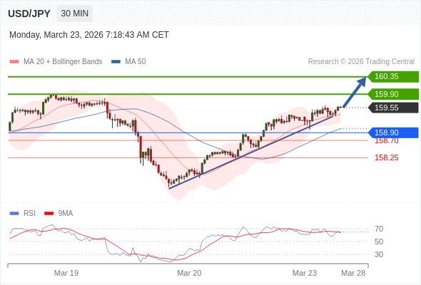 在 158.90 之上,看涨,目标价位为 159.90 ,然后为 160.35 。