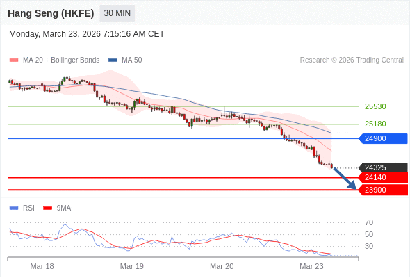 香港恒生指数期货 当日内: 存在压力。
