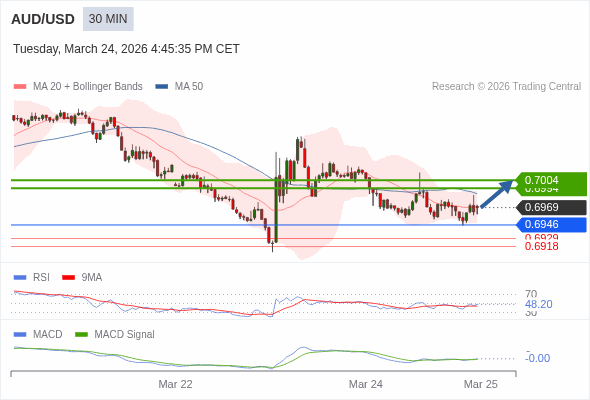 澳元/美元 当日内 : 有上涨的可能,目标价位定在 0.7004 。