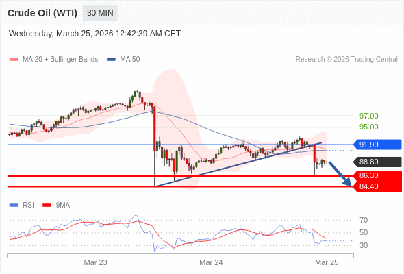 交易策略: 在 91.90 之下,看跌,目标价位为 86.30 ,然后为 84.40 。