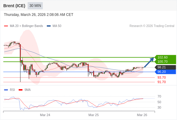 在 96.20 之上,看涨,目标价位为 100.70 ,然后为 102.60 。