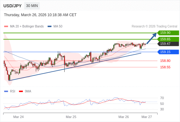 在 159.15 之上,看涨,目标价位为 159.65 ,然后为 159.90 。