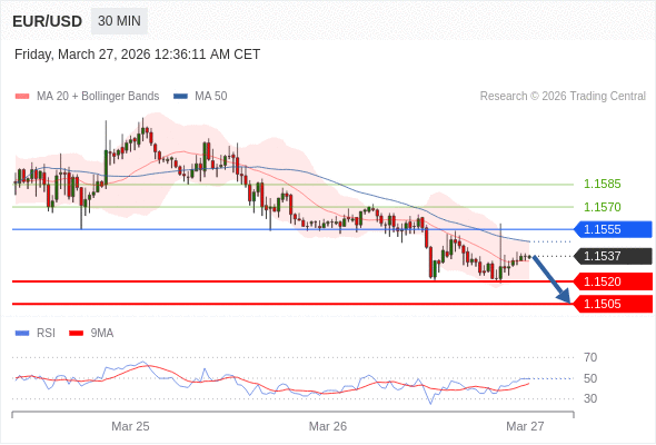 欧元/美元 当日内: 短期关键阻力位在1.1555。