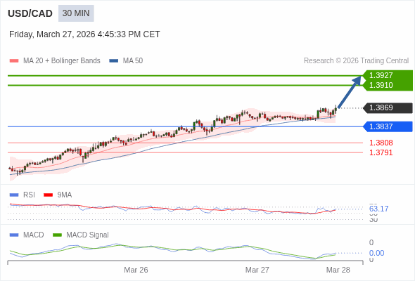 美元/加元 当日内 : 看涨,当 1.3837 为支撑位。