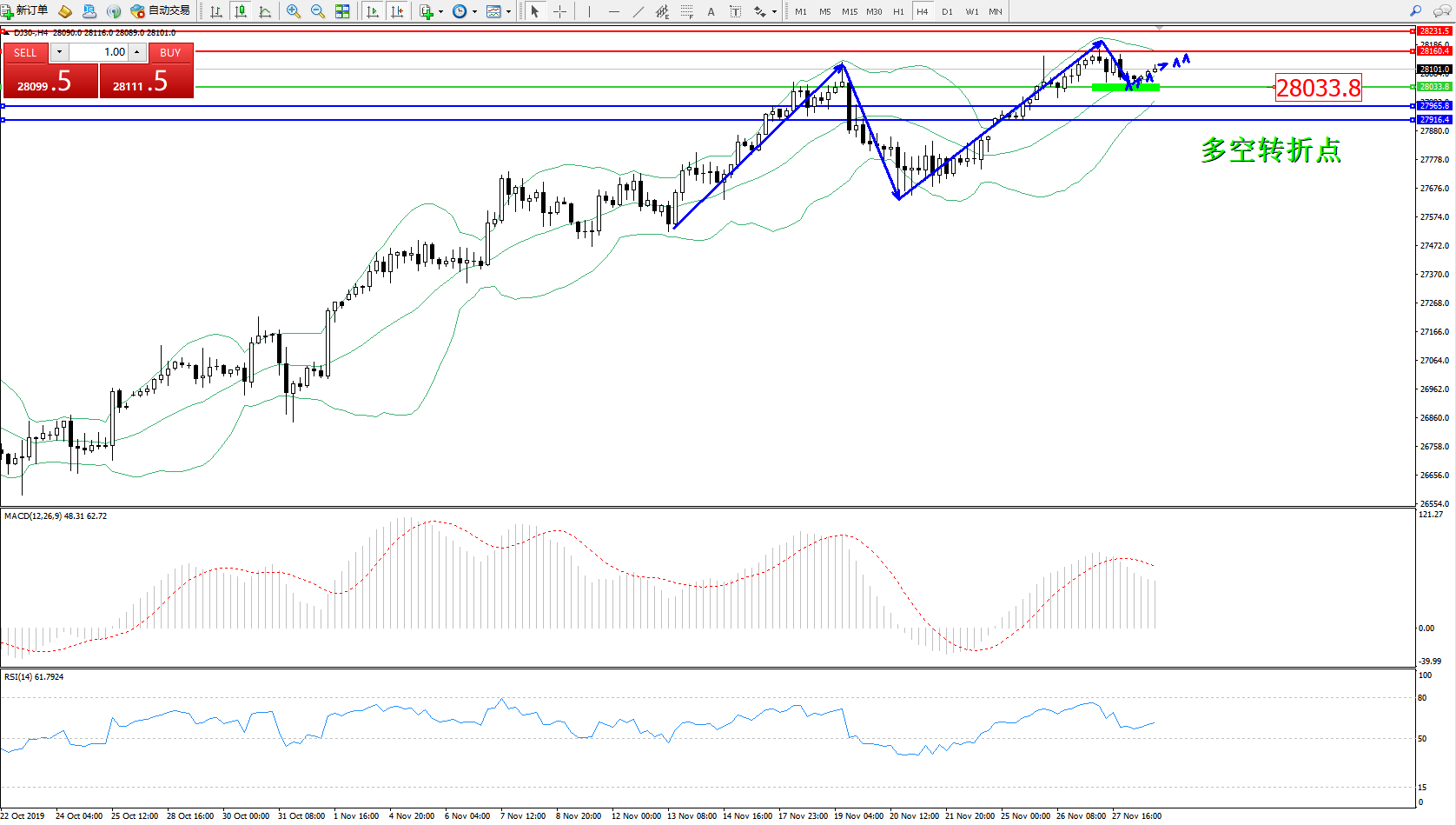 道琼斯指数DJ30—— 4小时K线图显示: