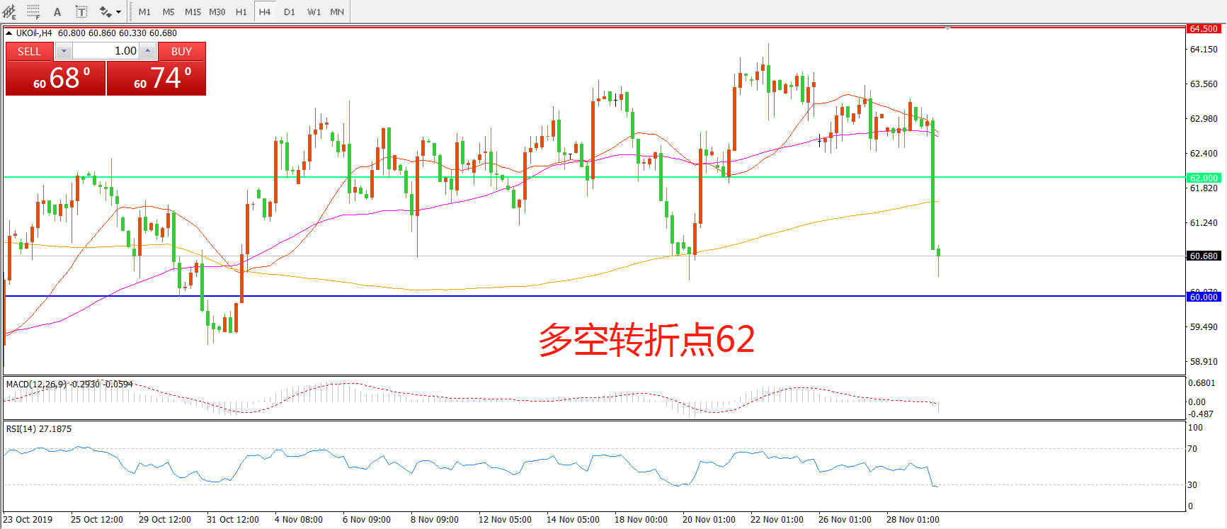 交易策略:在62.00之下看跌,目标60.00 57.50