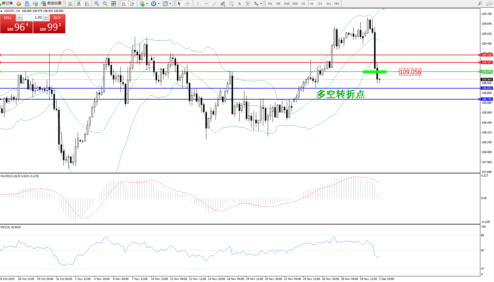 交易策略:109.056下方看跌,目标108.855、108.720