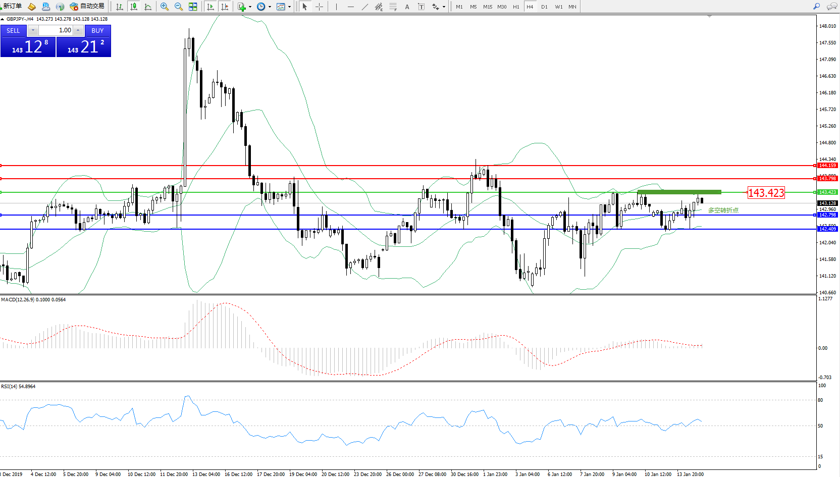备选策略:143.423上方看涨,目标143.798、142.409