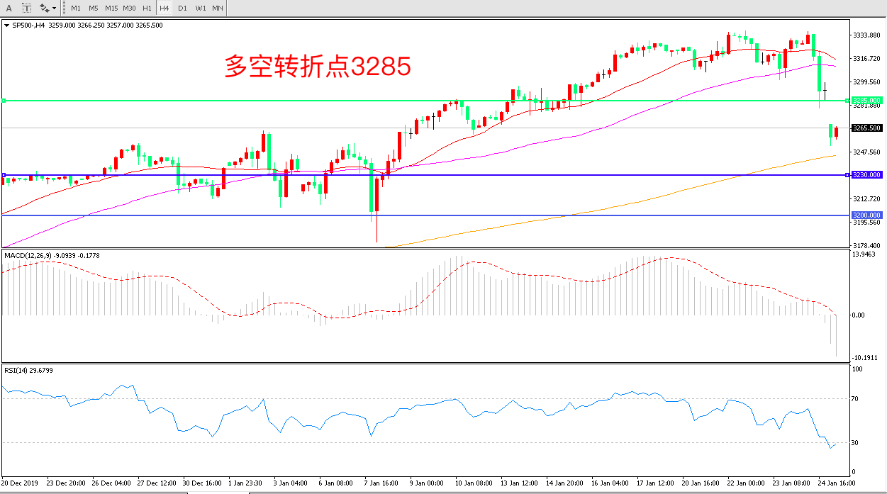 4小时图看,标普500跳空低开,短期走势有所回调,日内重点关注3285附近是否能够收复。