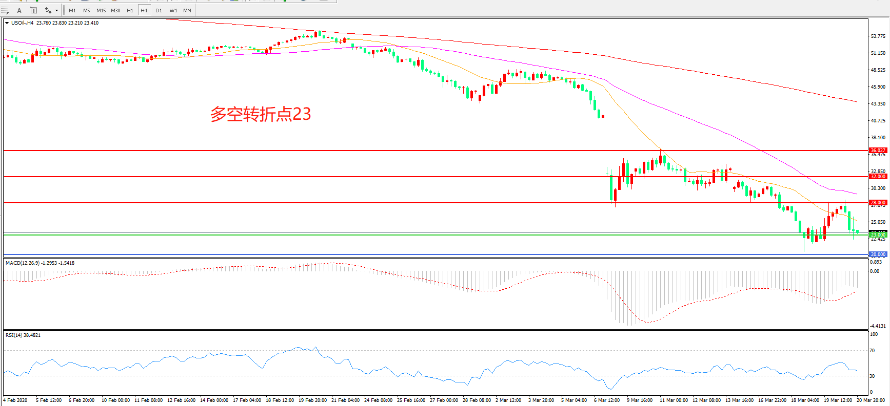 交易策略:在23.00之下看跌,目标20.00 18.00