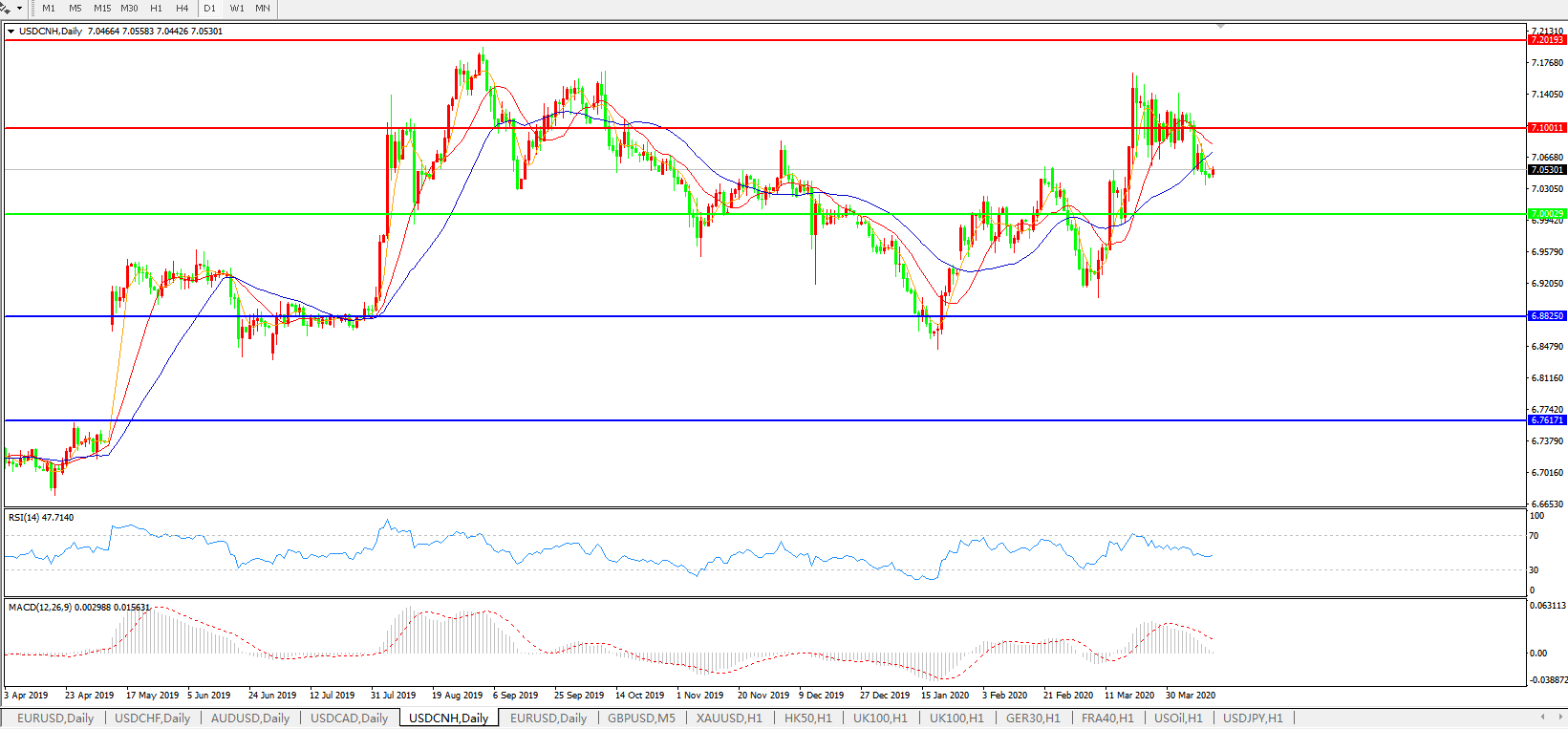 技术面简析:日图均线整体呈空头排列,汇价延续弱势继续下修,MACD运行于0轴上方但量能快速萎缩,RSI维持震荡走跌,预计短期汇价将7.0关口上方弱势运行,重点关注多空转折区域7.0关口的争夺。