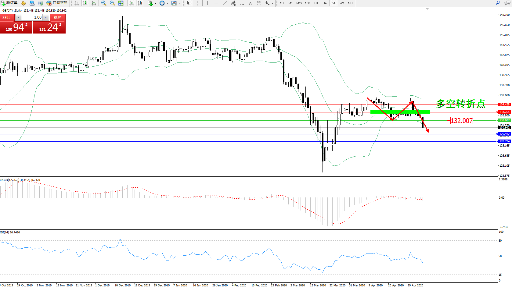 交易策略:132.007下方看跌,目标129.912、128.794