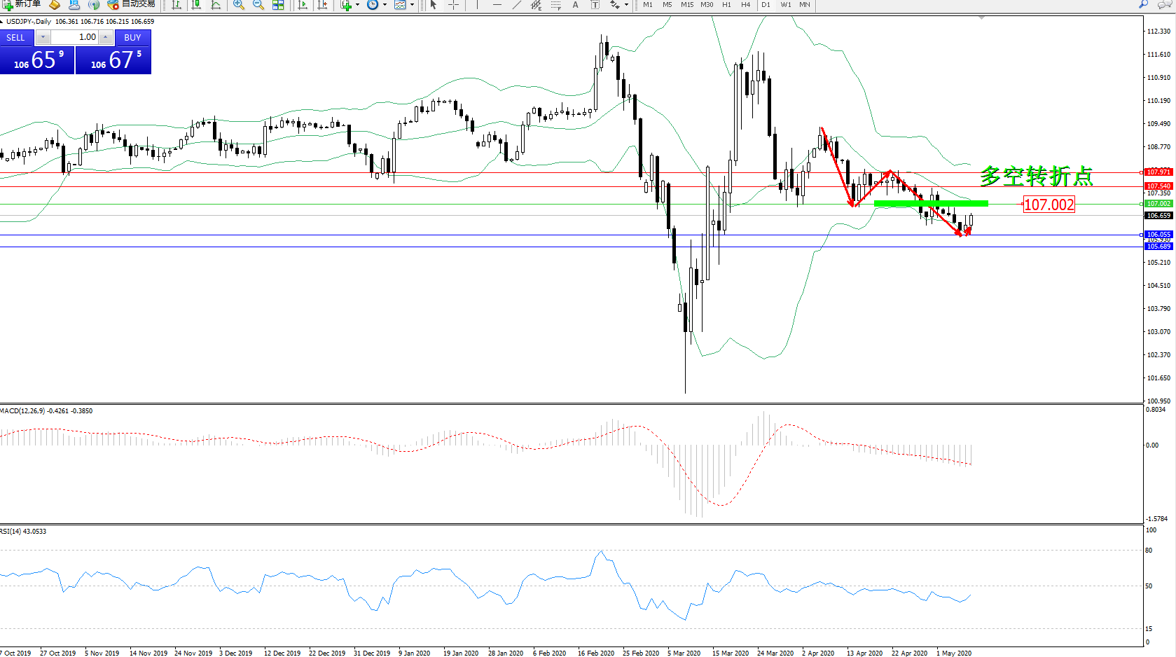 交易策略:107.002下方看跌,目标106.055105.689