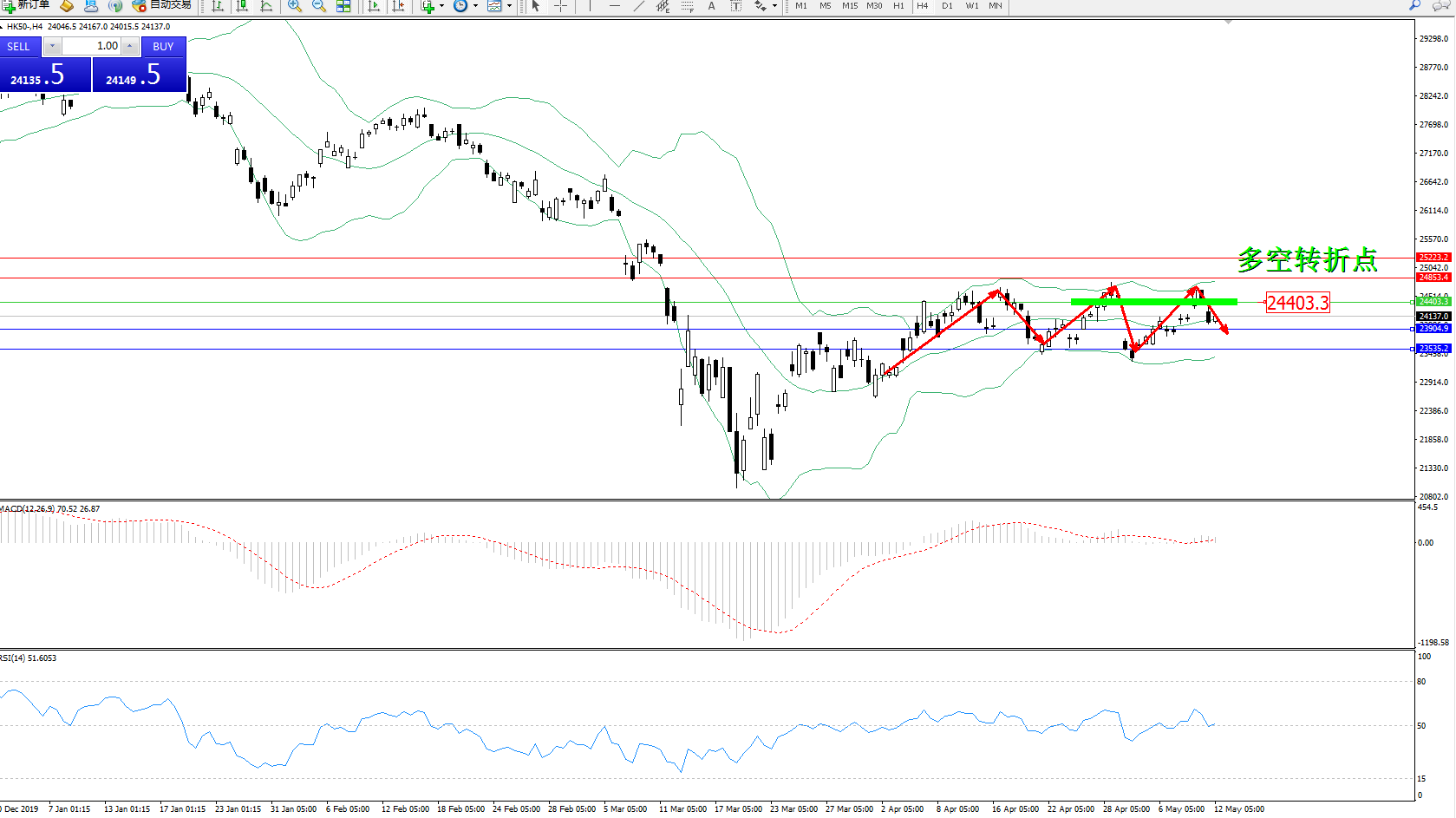恒指HK50 ——4小时K线图显示: