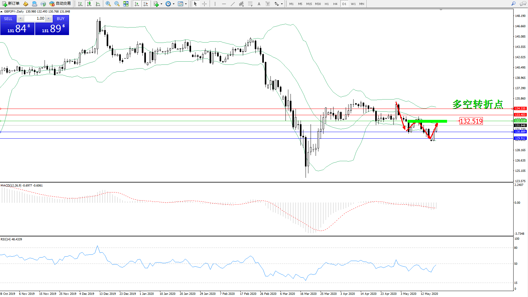 交易策略:132.519下方看跌,目标130.889129.912
