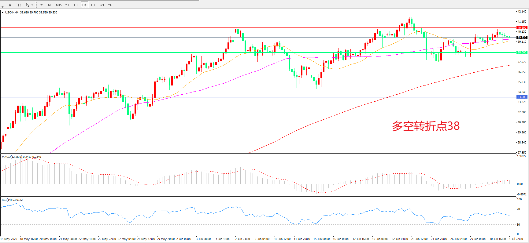 4小时图看,油价延续高位震荡,55周期均线成为短期支撑,40.50成为短期阻力,MACD红柱增加,RSI指标走平,日内延续震荡概率较大。