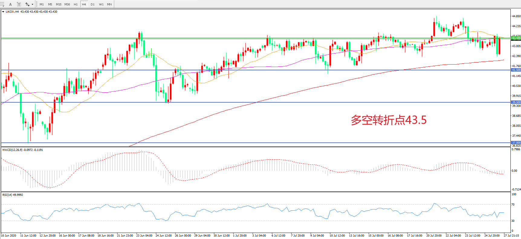 4小时图看,油价先跌后涨,短期波幅有所扩大,43.5美元成为短期多空分水岭,MACD红柱增加,RSI指标走平,日内延续上行概率较大。