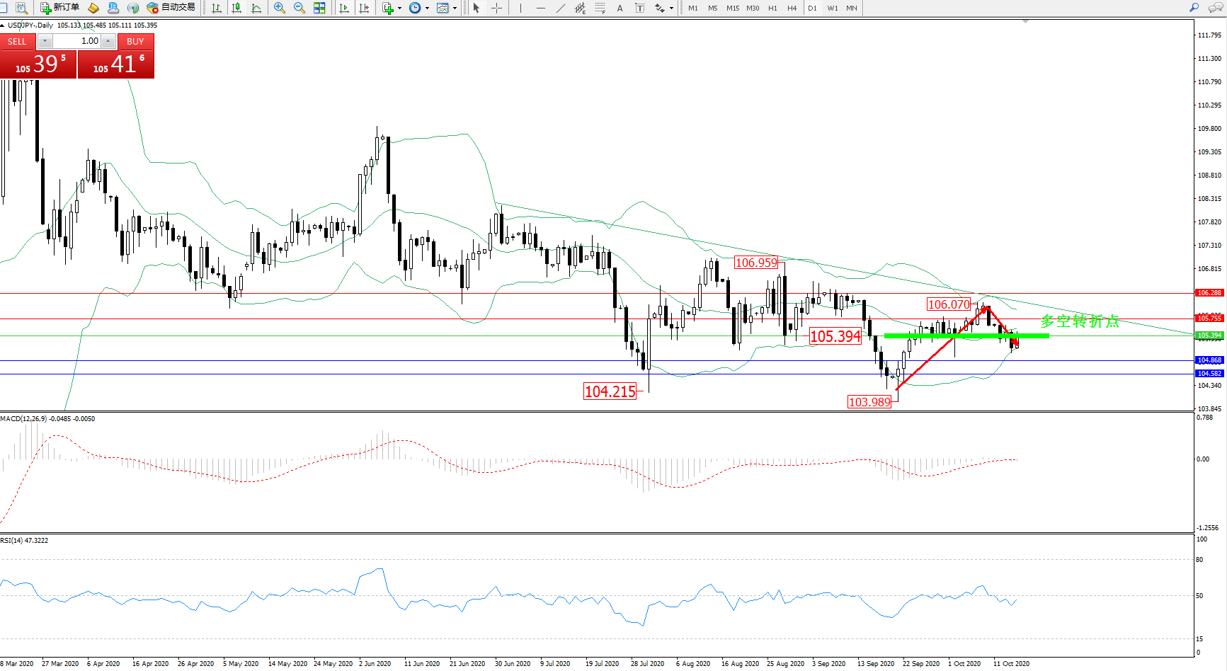 备选策略:105.394上方看涨,目标105.755、106.288