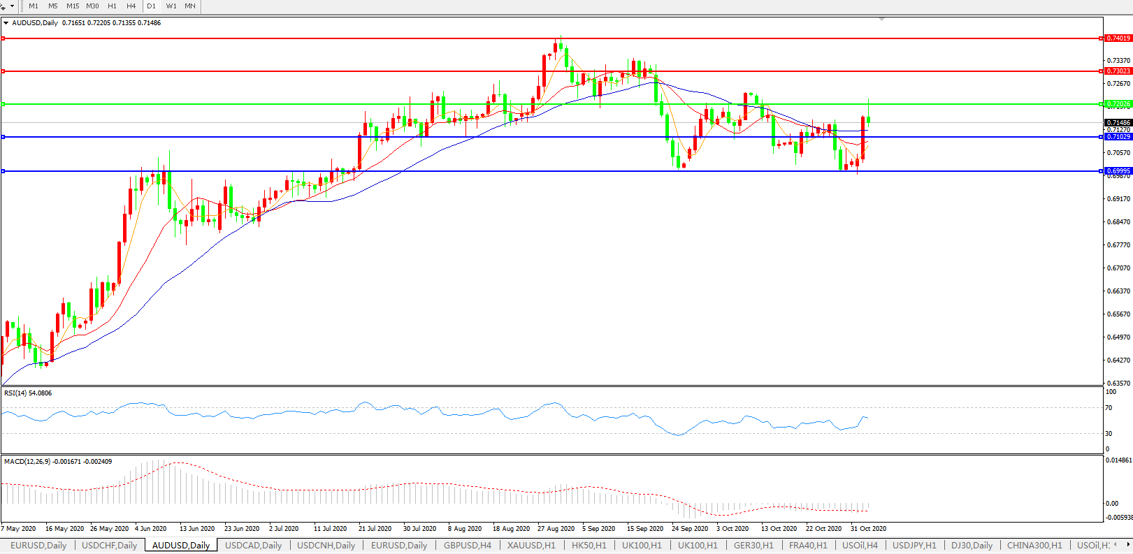 备选策略:0.7200上方看涨,目标0.7300、0.7400